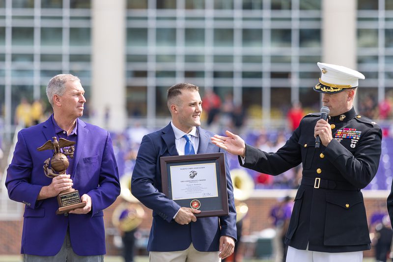 BELTON, Texas—University of Mary Hardin-Baylor (UMHB) senior Christian Studies major Thomas Henderson was presented with the United States Marine Corps (USMC) Commandant Trophy for outstanding leadership and superior accomplishments on Saturday, October 22 in a pre-game ceremony at Crusader Stadium. Henderson is from Keller, Texas, and is the son of Jerry and Penny Henderson. An active leader on the UMHB campus, Henderson serves as the Student Foundation president, student leader for 33 Authentic Manhood, and has served in other ministry roles in the community.