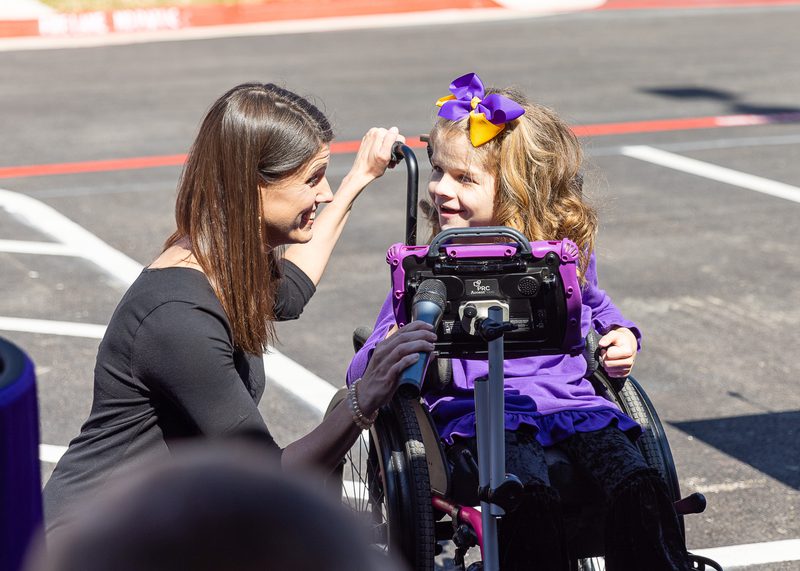 Molly Kate Elkins, daughter of UMHB alumni Tiffany and Barry Elkins, UMHB’s women’s soccer coach, shared a testimony about her experiences at the special needs lab. “I love the special needs lab and my college friends I get to make there. At the old lab, my wheelchair could not go through the same door as everyone else. I had to use a different door. With the new lab, I can go through the same door as my friends. The new lab is so cool! The very best part is the immersion room. I want to say thank you to all the people who helped us get a new lab. I can’t wait to play more!”