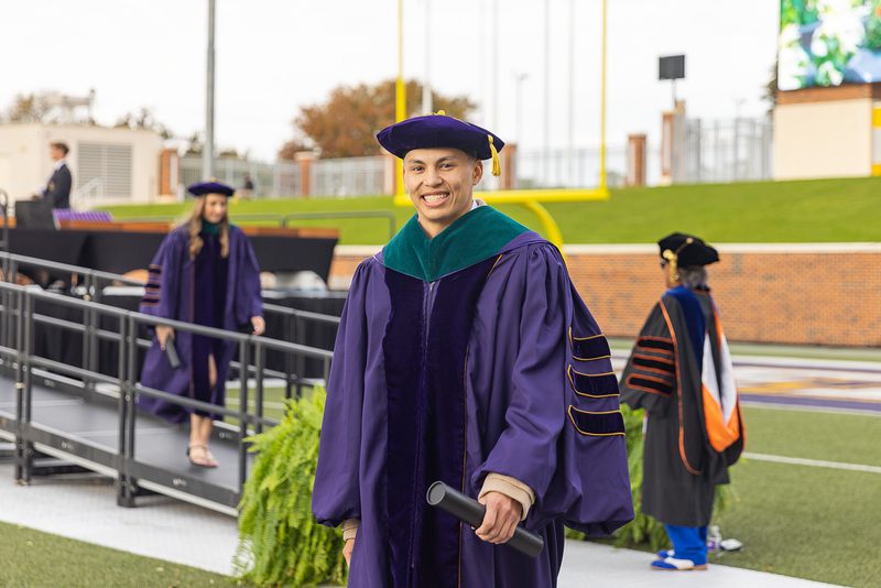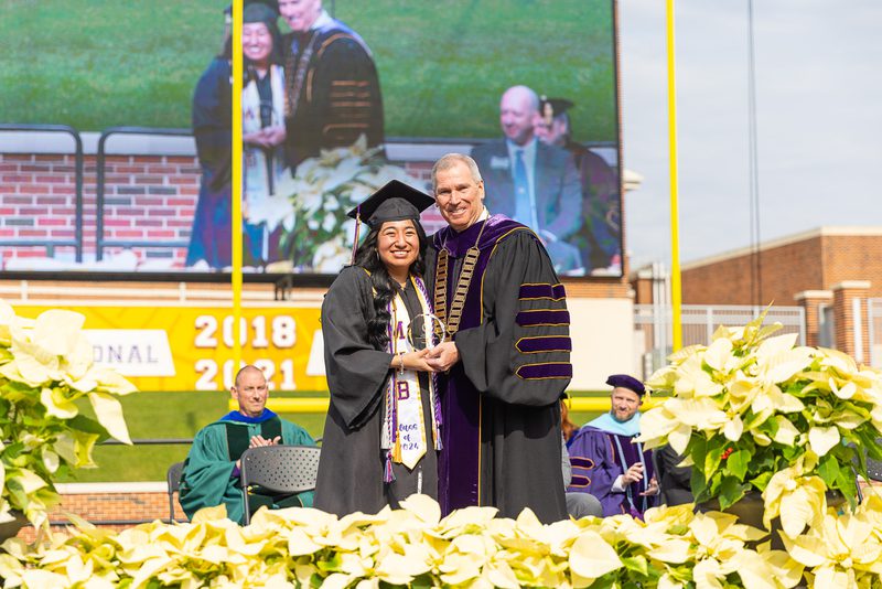 "Class of 2024, during your time at UMHB, your class brought a new energy to many of our great traditions such as Big Event, Easter Pageant, Cru Knights, Welcome Week, and Revival. You welcomed the old tradition of Forgiving Day and embraced the saying, 'In a world where you can cancel and block, be someone who forgives.' You have used your talents to better this university and the world around you, and you are leaving behind an impressive legacy of leadership and service for those who follow in your footsteps," he said. "Colossians 3:17 tells us, 'And whatever you do, whether in word or deed, do it all in the name of the Lord Jesus, giving thanks to God the Father through Him.' We are honored that you chose Mary Hardin-Baylor. As you embark on your careers, graduate school, or whatever is next, please know your Mary Hardin-Baylor family loves and is very proud of you." He finished with, "Please come back and visit us often. We'll have some Cru Dogs and purple ice cream waiting for you. May God richly bless you as you seek to fulfill His purpose for your lives."