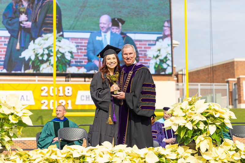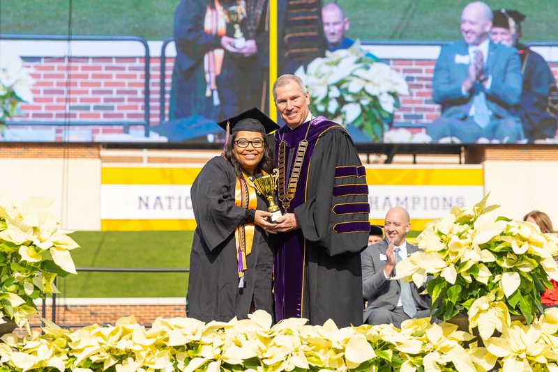 Student recognitions during the ceremony included the Provost Medal for highest overall GPA, which was awarded to nine students who each graduated with perfect 4.0 grade point averages: Caroline Allen of San Antonio, TX, Selah Marie Bentz of Fallbrook, CA, Gerald Adam Brady of Temple, TX, Andrew Huneycutt of Leander, TX, Rachel Leslie of Temple, TX, Robert Benjamin Mills of Longview, TX, Elise Ott of Cedar Hill, TX, Emma Noelle Vaught of League City, TX, and Presley Shane Wall of Decatur, TX. Amanda Stockton of Houston, TX, was the scripture reader.